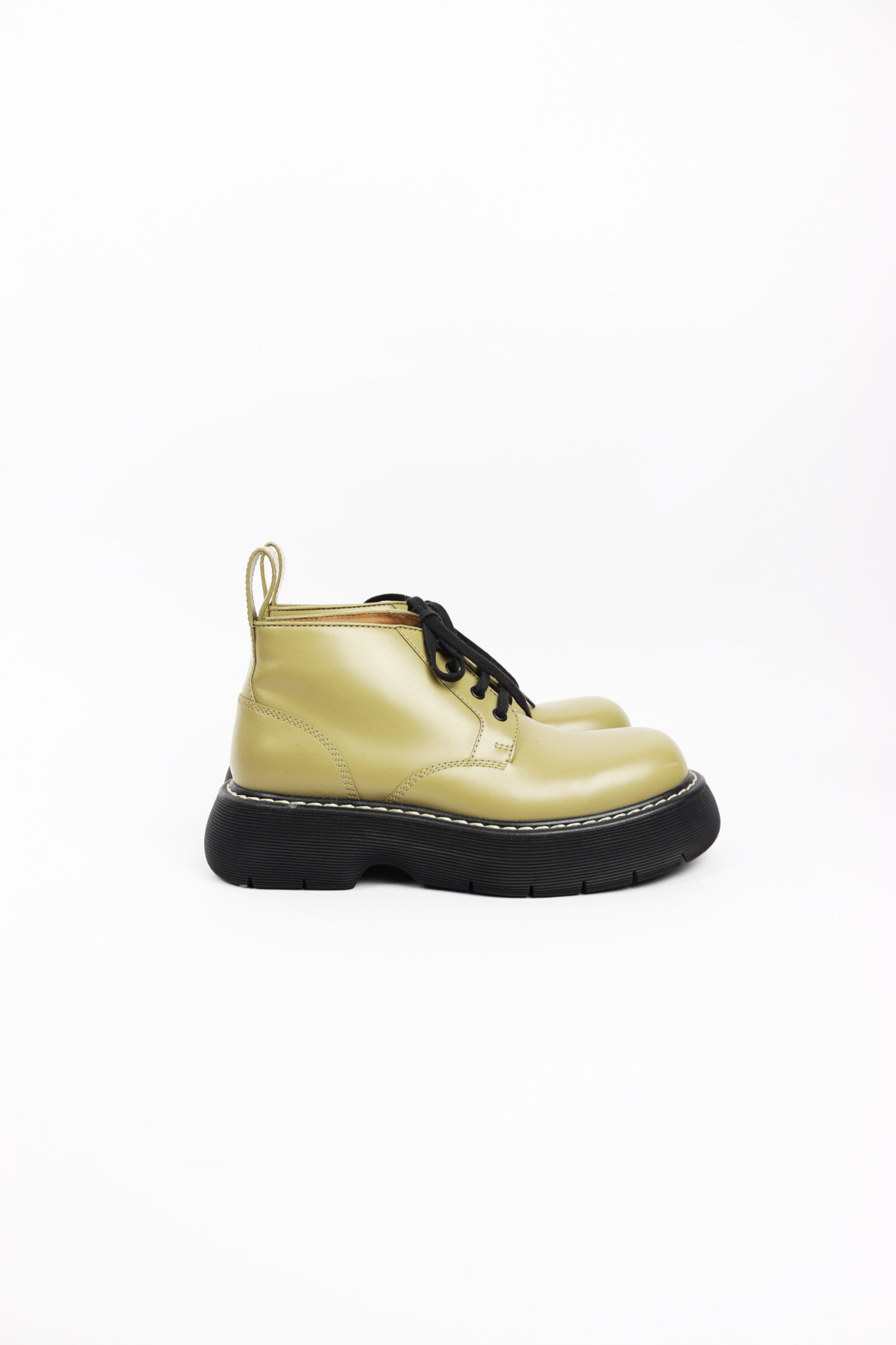 Olive green calfskin lace up boots with that chunky rubber platform that Bottega Veneta made their signature. The Bounce boots turned the combat boot into something luxurious with buttery soft leather and contrast stitching that shows off the craftsmanship. The platform gives you height while staying comfortable enough to actually walk in. Works with everything from dresses to jeans when you want boots that look this good.