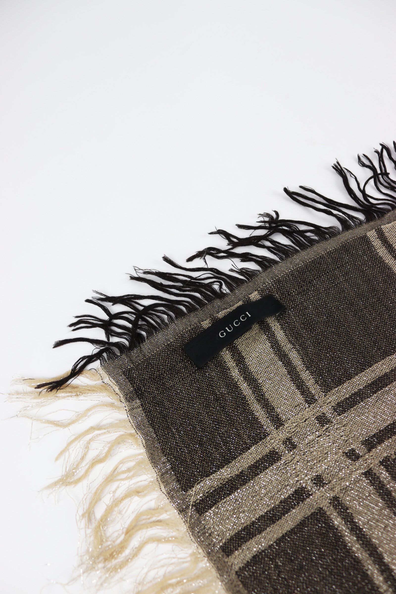 The GG monogram, designed by Aldo Gucci in the 1960s, turned into one of fashion’s most recognizable symbols. What started as subtle detailing on leather goods became the all-over pattern on all kinds of Gucci items, including this beige wool and silk blend scarf. The diamond jacquard weave with those chunky fringes gives it texture and weight without feeling heavy.