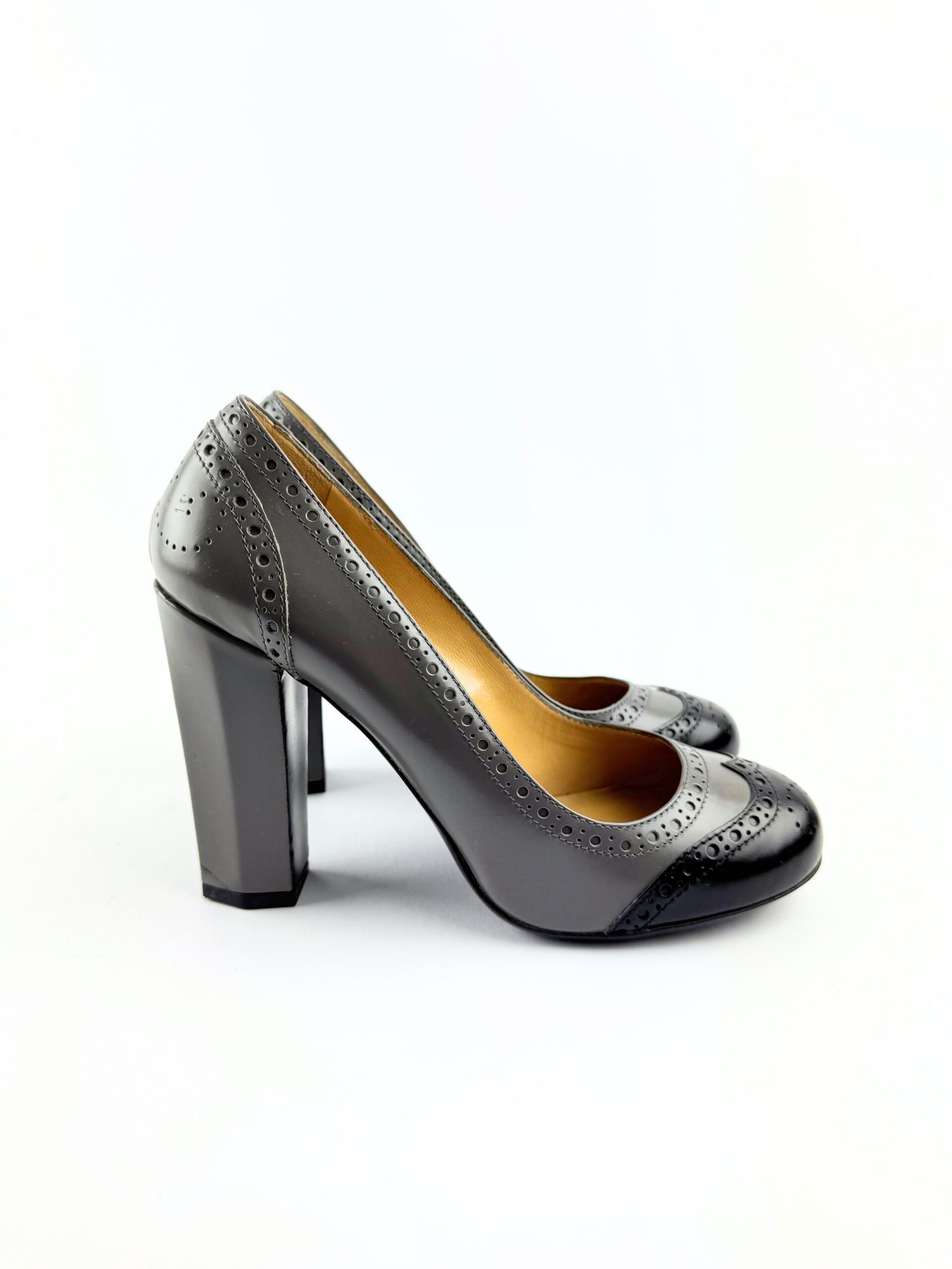 The Miu Miu two-tone heels with rounded toe and classic detailing are crafted in smooth leather, combining grey and black in a brogue-inspired design. The perfect pair for your preppy fall look.