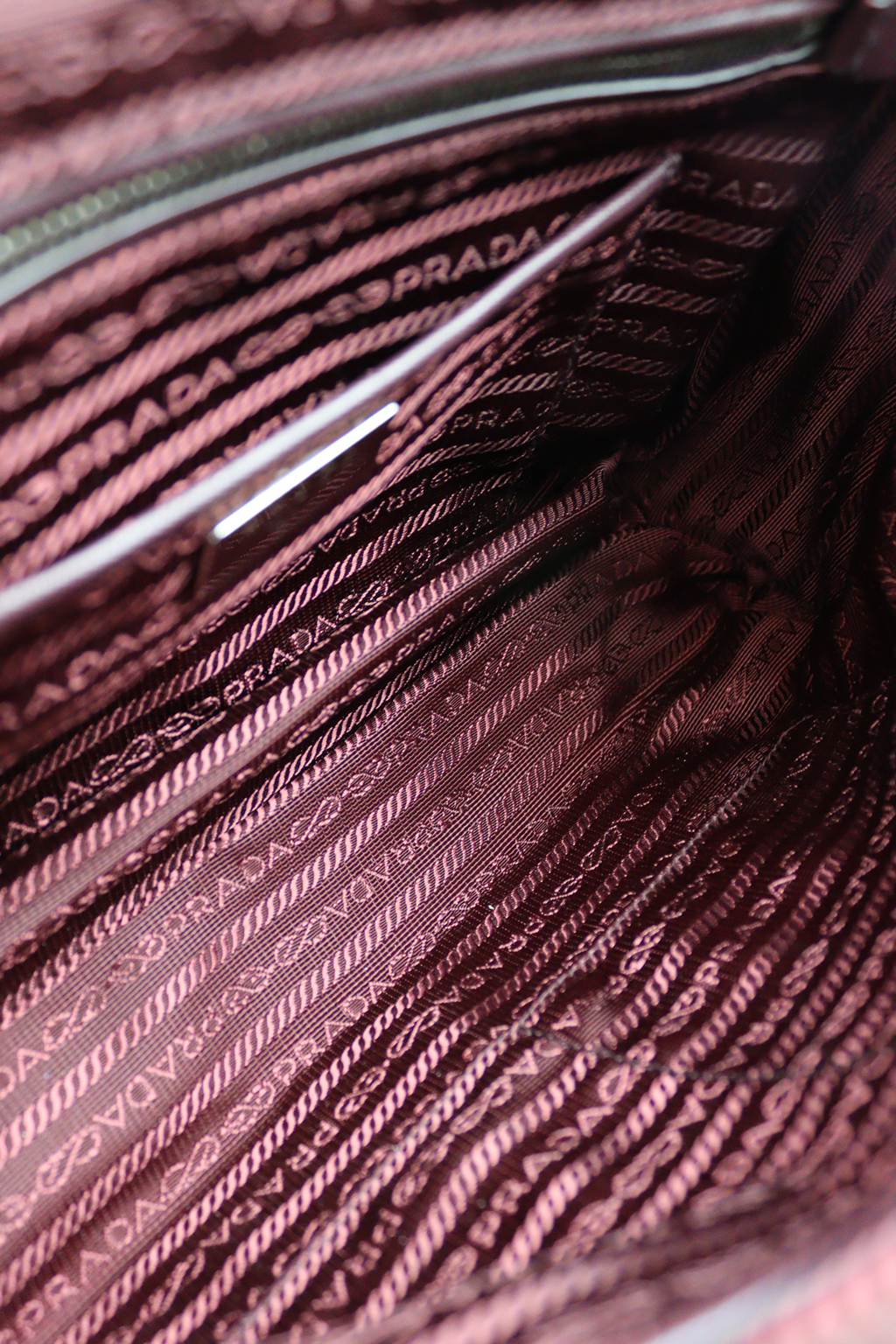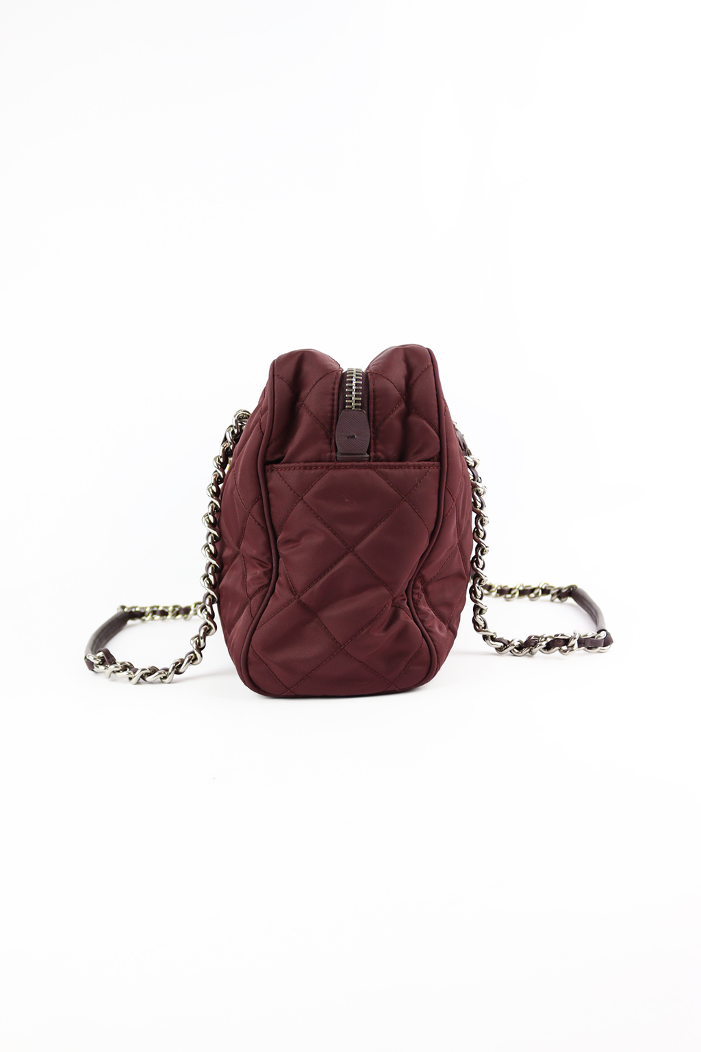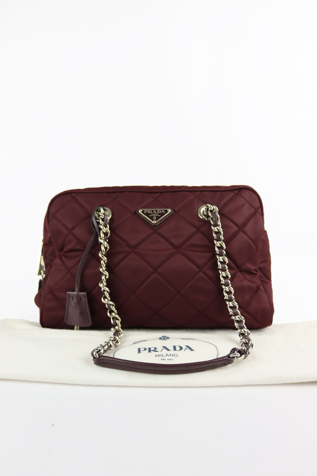 Prada’s Tessuto nylon isn’t an afterthought — it was introduced in the 1980s as a deliberate provocation, luxury pricing on a utilitarian fabric, and it worked. This one is quilted in a diamond pattern in deep burgundy, with silver chain-and-leather straps, a top zip closure and the enamel triangle logo plate on the front. Lighter to carry than leather, and the quilting gives it enough structure to hold its shape. See pictures for details.