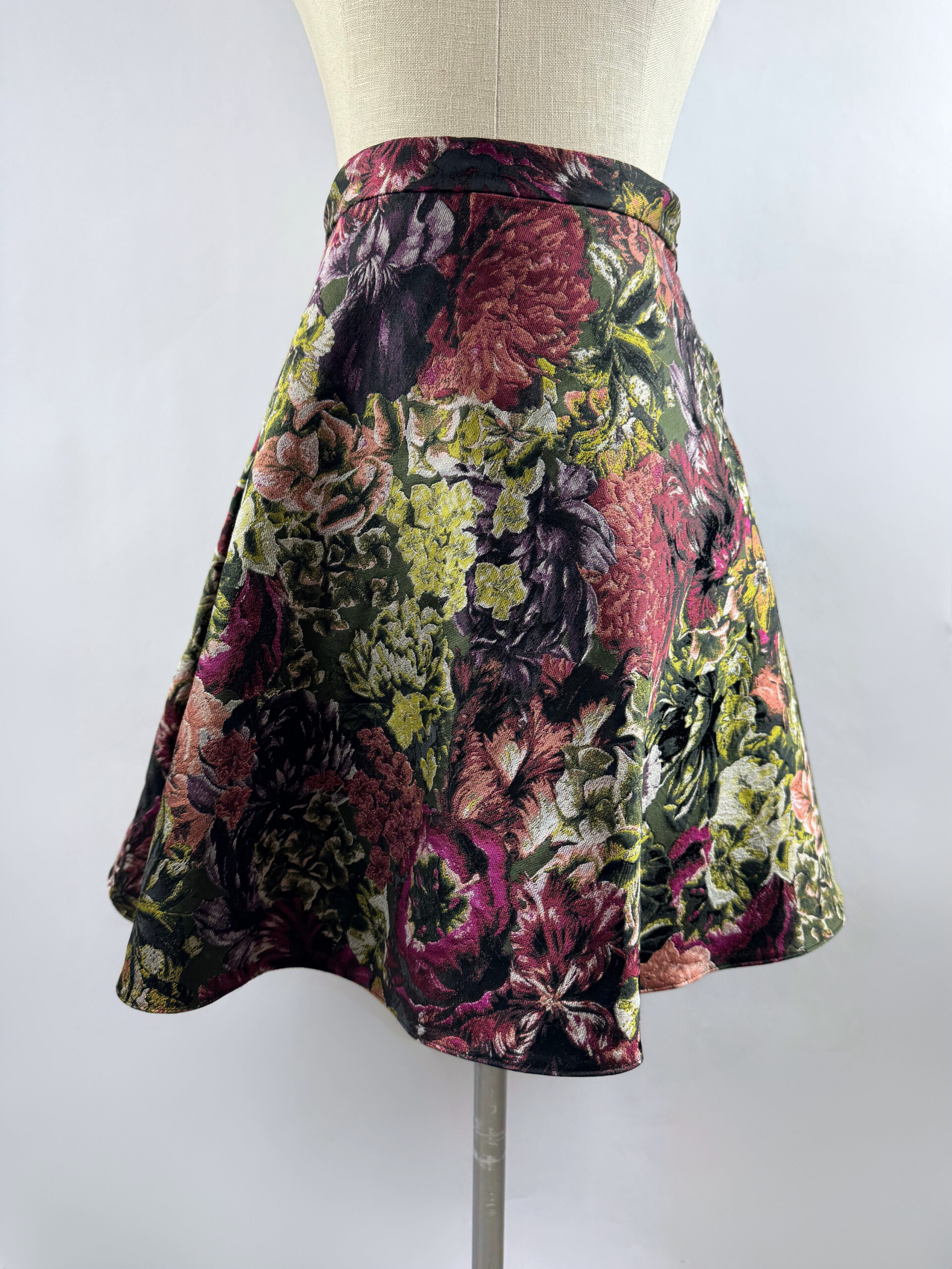 A-line skirt from Valentino with a rich floral jacquard in deep tones of green, pink and burgundy. Designed with a fitted waist and a softly flared hem, it falls above the knee. Finished with a concealed zip closure at the back.